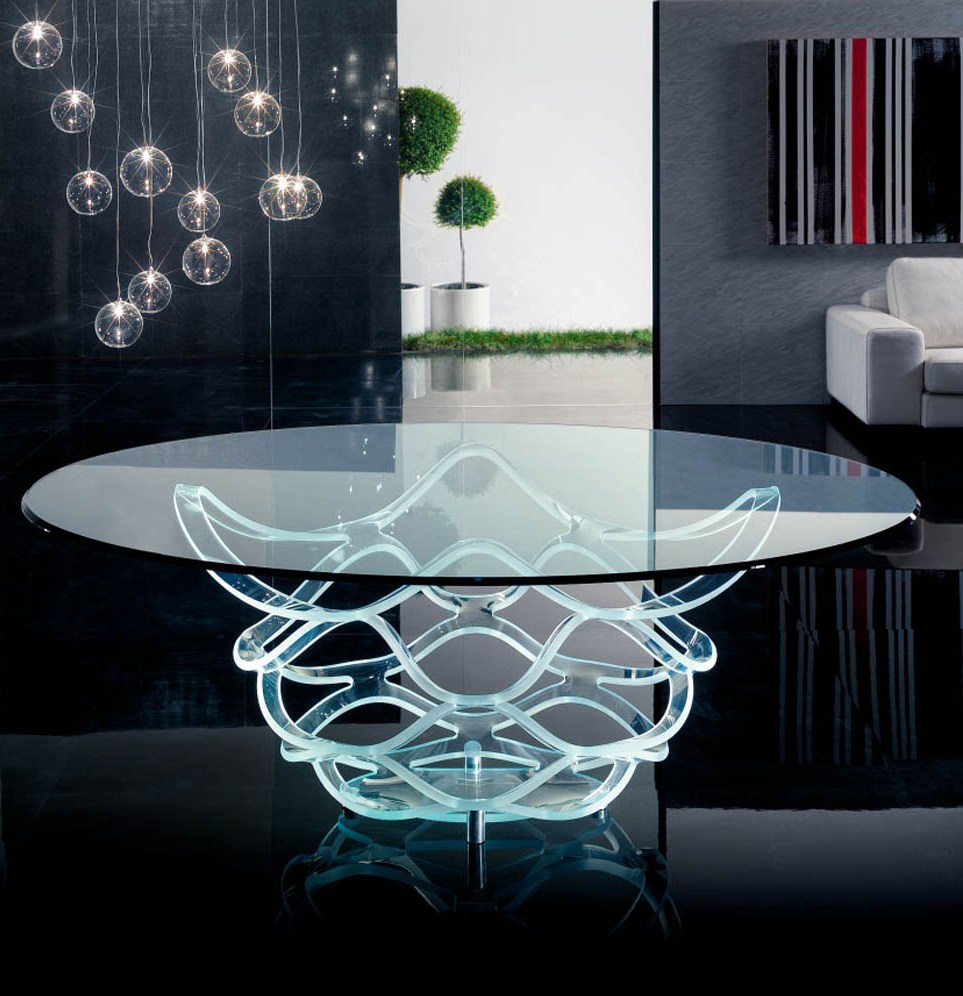 Набирает все больше популярности среди современного населения. Все чаще выбирают такие модели столов для оформления различных интерьеров. Ведь они, благодаря своей прозрачности, смотрятся более воздушно, а это способствует как минимум, сохранению визуального свободного пространства. Опоры их делают из любых материалов. Это могут быть: деревянные коряги, рога крупного животного и прочие.