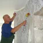 - Далее этим же раствором намазываете подготовленную полосу обоев и, при помощи валика наносите ее на стену.