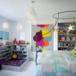 - Разделение пространства. Часто родители нагромождают детскую всем, чем попало. Детская комната прежде всего для ребенка, поэтому там нужно хранить только нужные ему вещи. Если размеры комнаты меньше, чем хотелось бы, то это можно интересно обыграть. К примеру, установить кровать под потолком, прикрепить удобную лесенку, а под кроватью разместить письменный стол или сделать игровое место. Или же наоборот – кровать разместить под лесенкой, а сверху оставить место для выполнения уроков и чтения. Спальное место превратится в уютный уголок, где ребенок будет чувствовать себя комфортно. Конечно же, при создании такого дизайна надо учитывать возраст ребенка и его потребности.