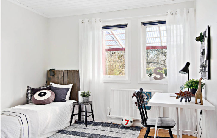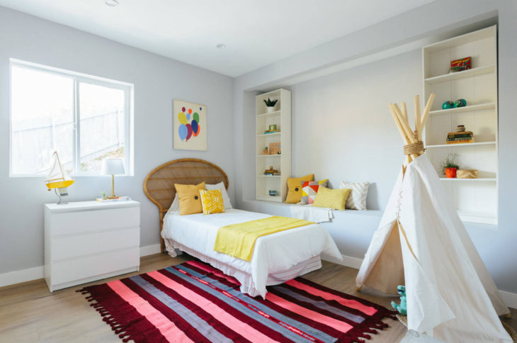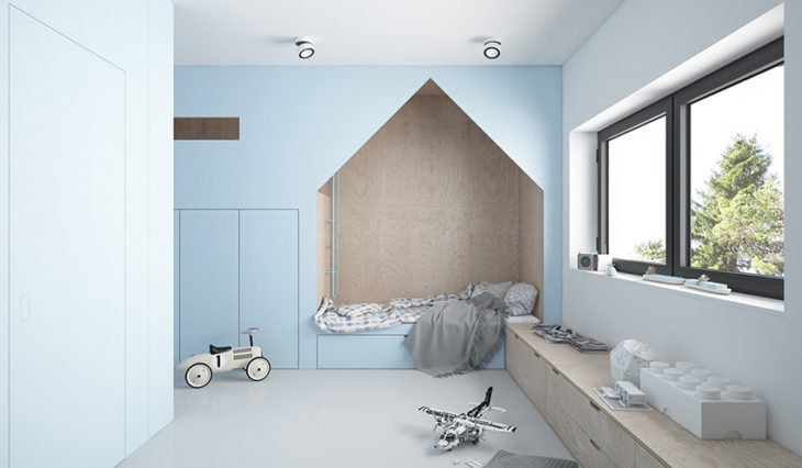 Правильное использование пространства – важная вещь как для родителей, так и для детей. Сэкономить место для хранения и организовать дополнительный уголок для ребенка поможет встраиваемая мебель. Как мы упомянули ранее, лестницы в детской могут создать не только игровую обстановку, но и служить ящичками для хранения, полками для книг. Еще одним дополнительным местом хранения может стать подиум под кроватью. Туда можно складывать белье или игрушки вашего малыша.
