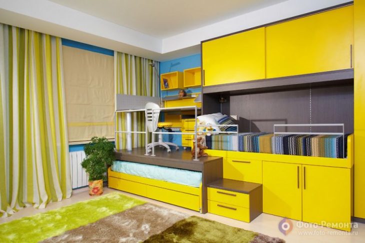 Не все родители могут выделить каждому ребенку по комнате. В таких случаях нужно подойти с фантазией к обустройству детской. Сейчас актуально заказывать мебель с необычными архитектурными очертаниями. Всякие карнизы, колонны, панели и другие элементы будут смотреться намного интереснее обычных двухэтажных кроватей. Другой вариант — две кровати можно расположить перпендикулярно друг к другу, разделив их тумбочкой, столиком либо небольшим стеллажом. Воплотив в жизнь нестандартные идеи, можно сэкономить больше места там, где, на первый взгляд, это кажется нереальным.