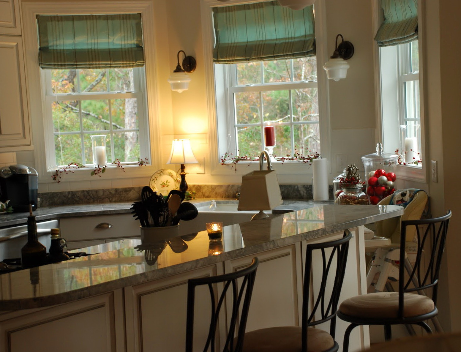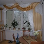Ткани не должны быть тяжелыми, иначе эркер будет напоминать занавесы в театре. Отличный вариант оформления в больших и просторных кухнях. Для придания некой глубины оформления, можно применить несколько цветов или фактур. Чтобы декорировать эркеры, можно выбирать короткие варианты штор, длина которых не ниже, чем подоконник, а также можно выбирать рулонный тип, римский, французский, жалюзи. Также не стоит использовать драпировки для перекрытия всего окна, дабы не затемнять маленькое, плохо освещаемое помещение.