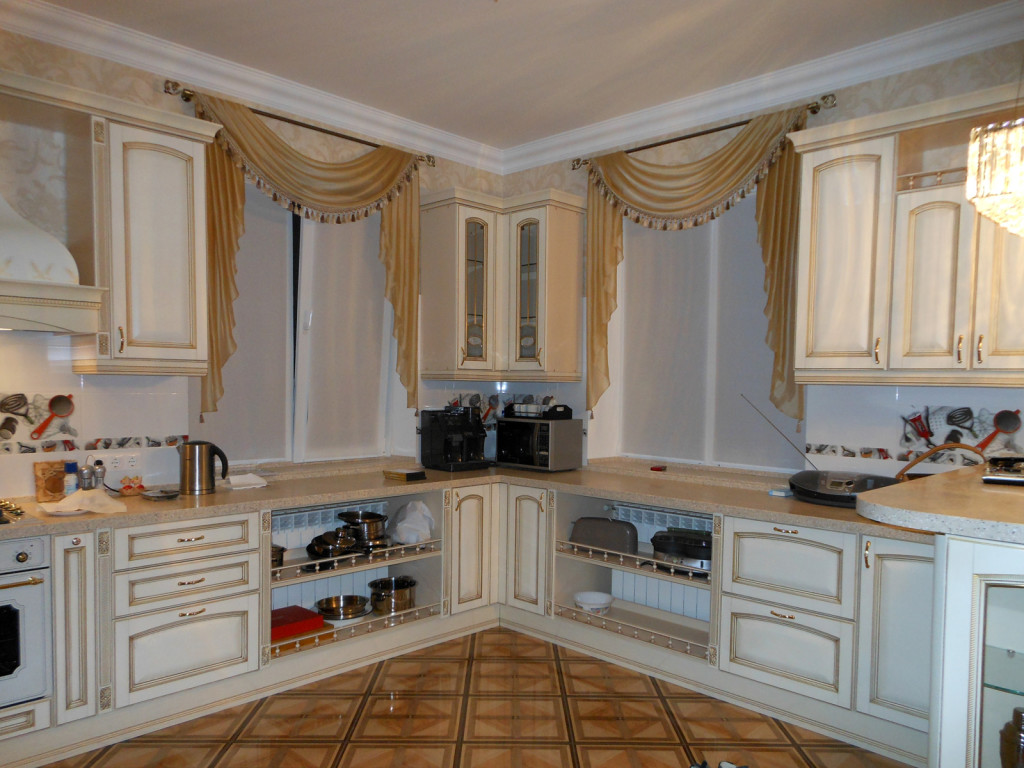 В Западных странах окна в кухнях оформляют при помощи ламбрекенов, маркиз или воланов.