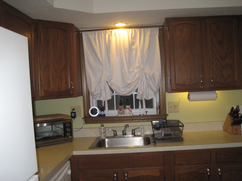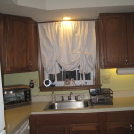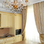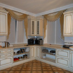 В маленьких кухнях на окнах должны быть обязательно светлые тона штор, чтобы помещение не казалось визуально меньшим. Тем не менее, можно использовать и темные цвета. В этом случае используются шторы-ламбрекены, а может и римские.