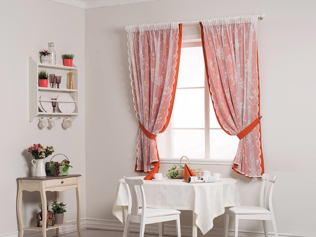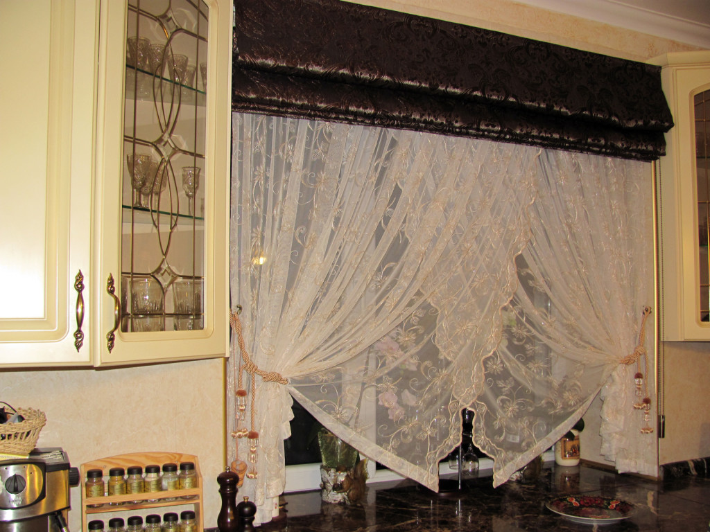 Прекрасно будет выглядеть оформление кухни вуалью из органзы с вышивкой в цветочном или восточном мотиве.
