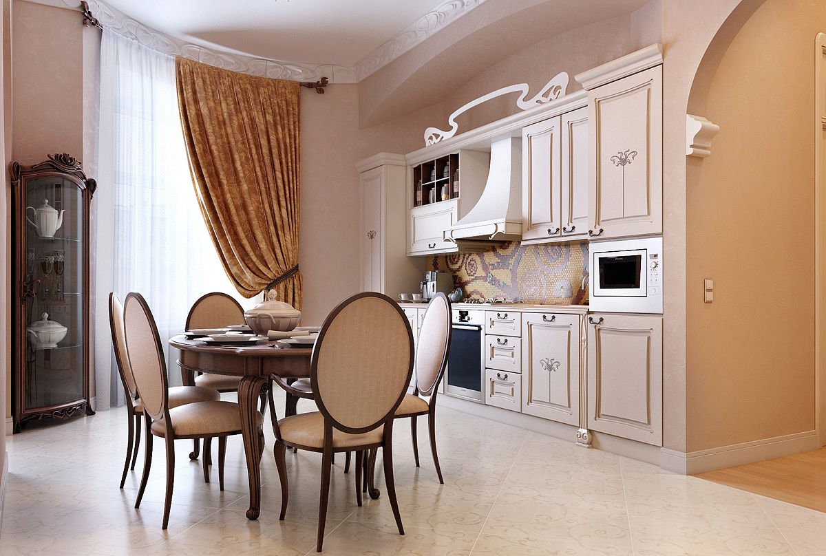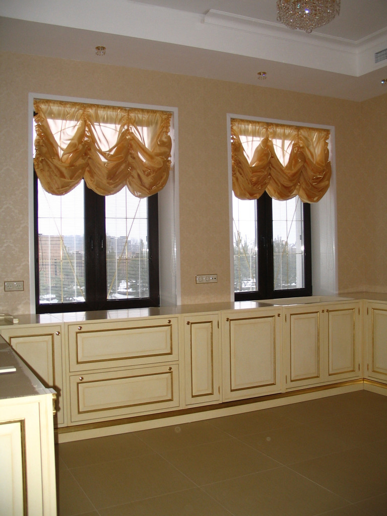Они подойдут тем, кто обладает изысканным вкусом и любит элегантность во всех деталях. Такие шторы расходятся плавными эластичными волнами. Кухни, выполненные во французском стиле, обладают своим неповторимым шармом и имеют очень торжественный вид.
