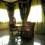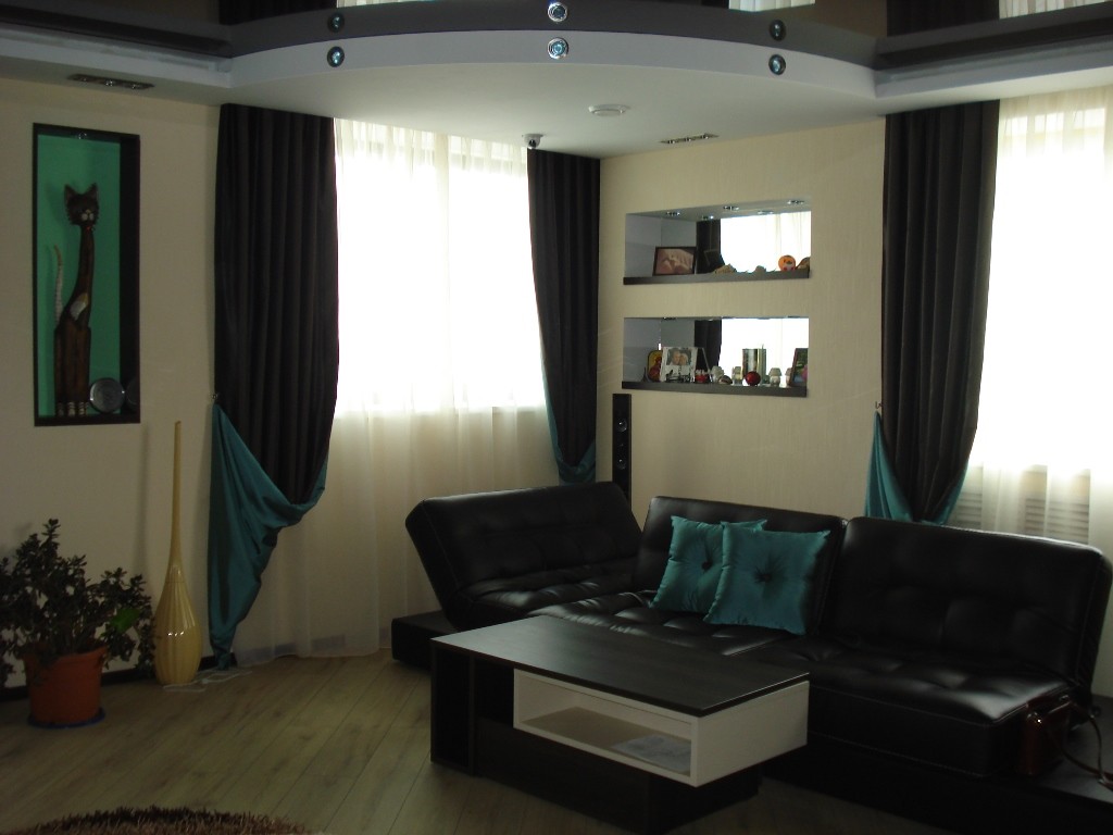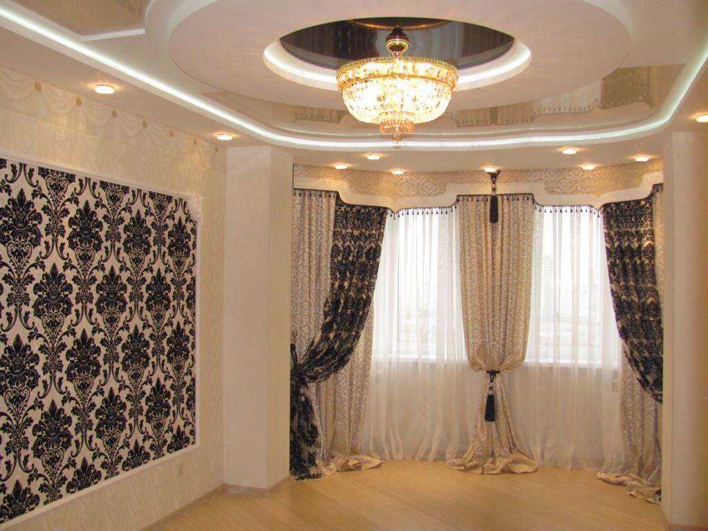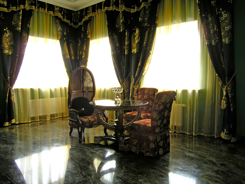В плане цветового решения в сочетании штор с отделкой интерьера, в данном сезоне позволительно использовать творческий подход! К примеру, очень стильно и оригинально будут выглядеть шторы такого же тона, как и основная отделка зала.