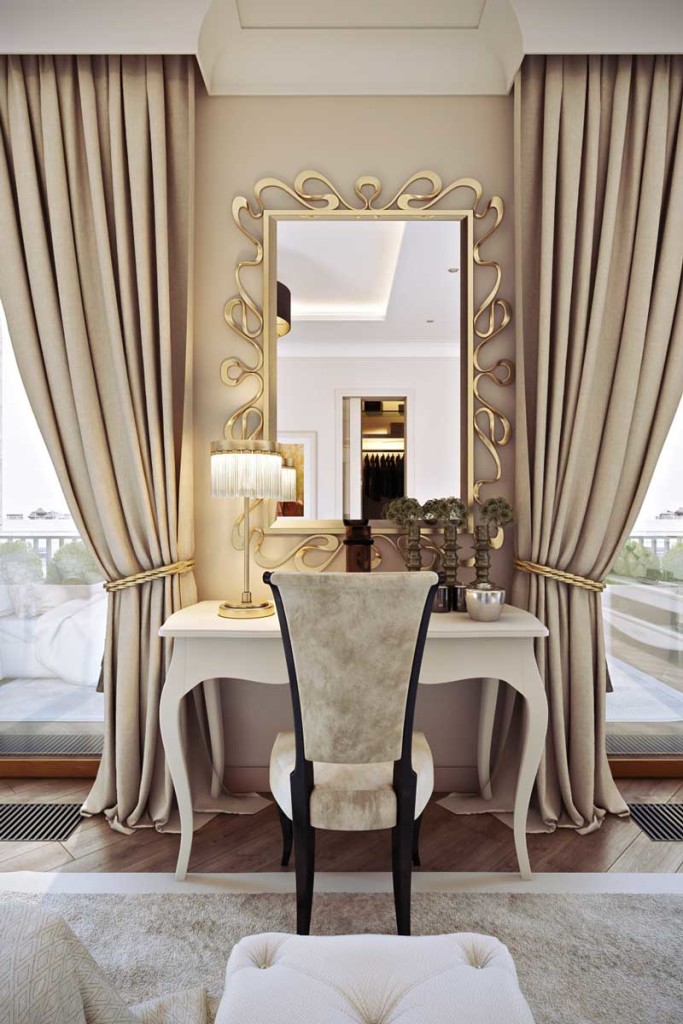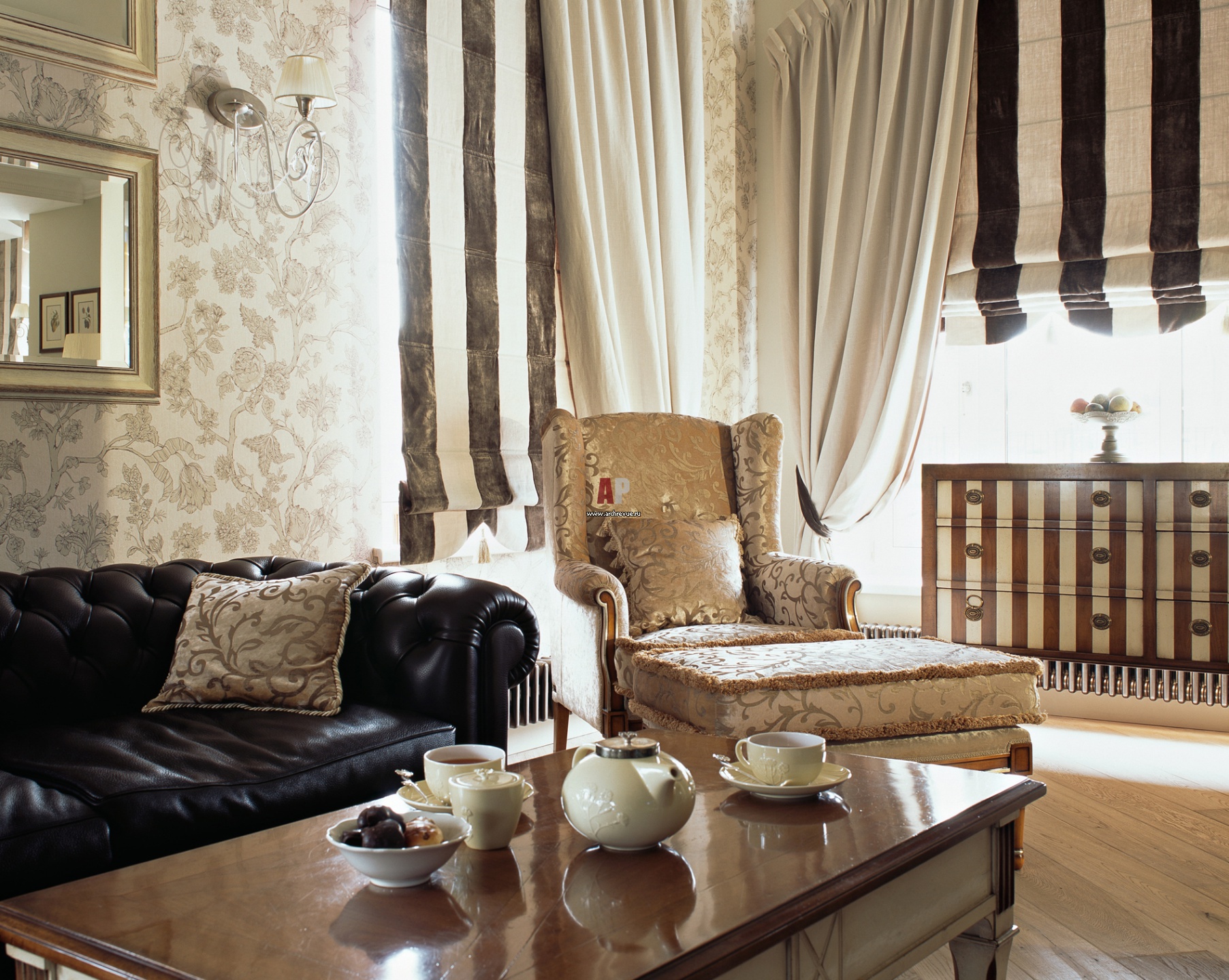 Классика всегда остается на пике модных вершин! Здесь прекрасно вольются в интерьер объемные шторы, да и к тому же, с драпировкой. Можете использовать самые обычные варианты штор, которые прекрасно сочетаются с римскими.