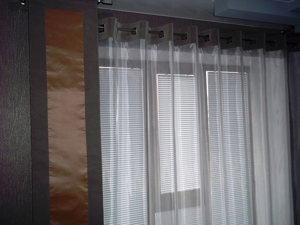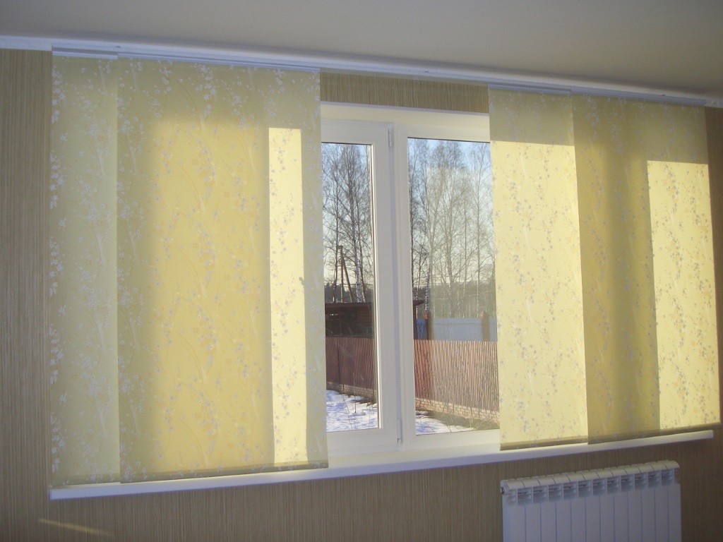 По сути, японские шторы (или панельные – второе название) представляют собой тканевое полотно и карниз. Тканевые полотна двигаются по карнизу по тому же принципу, как и механизм дверей купе.