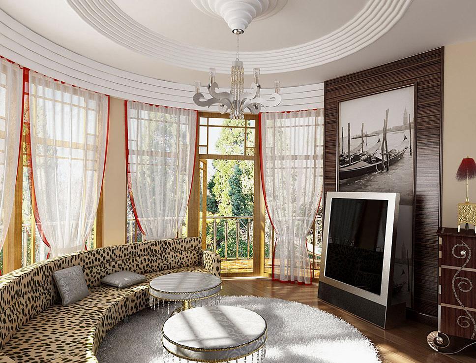 Чтобы у Вас в гостиной дизайн штор для зала отличался своей оригинальностью, предпочитая объемные и, в тоже время, легкие шторы, выбирайте определенные тафту или парчу. Сама структура этих тканей позволяет абсолютно не утяжелять атмосферу помещения.