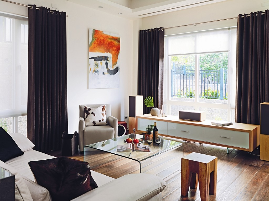 В гостиной, которая будет оформлена в минималистическом стиле, прекрасным решением будут шторы, выполненные из легкой и светлой ткани. Самый лучший вариант – это белого цвета.