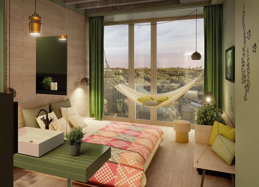 Расставить яркие акценты здесь поможет интересный декор, а также шторы.