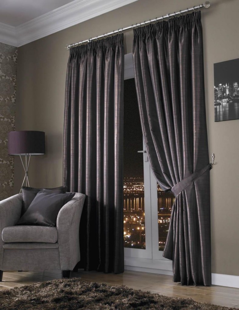 К новинкам штор в зал 2016 также можно и отнести именно темные варианты. Они являются классическим вариантом, но и способны создать более строгий интерьер помещения. Выбирая такой вариант текстиля, опирайтесь на цветовое решение обивки Вашей мебели или подушек на диване, а может и на торшерные абажуры.