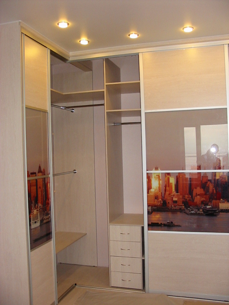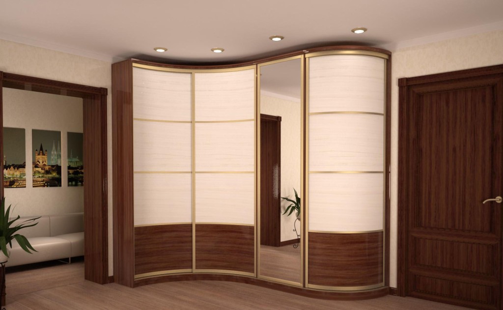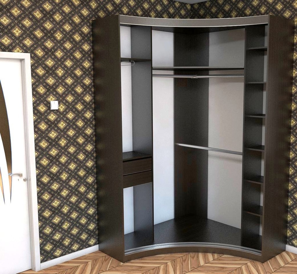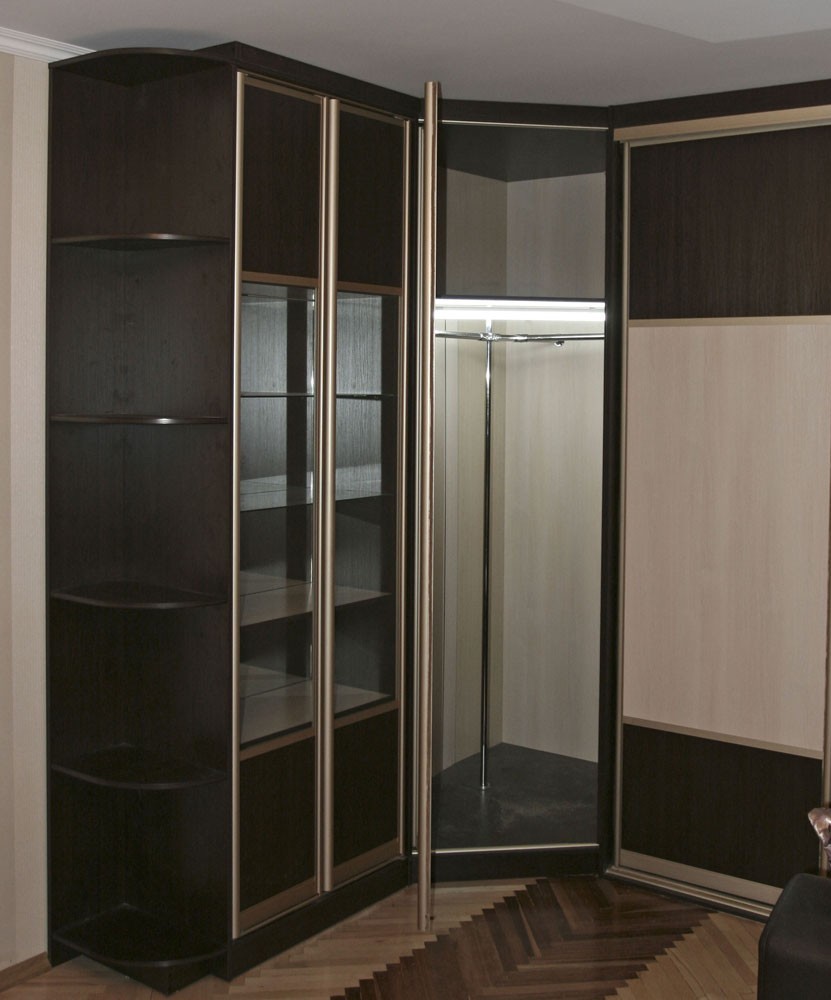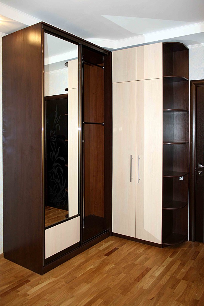 Он может быть не только угловым. А также еще в нескольких вариациях, таких как: трапециевидной или Г-образной. Важно понимать основное отличие между ними. В Г-образном шкафу купе торцы соединяются между собой. Соответственно, монтаж такого изделия достаточно сложный, а значит и цена его высокая. У трапециевидного шкафа неправильные параметры.Используют для обустройства отдельной гардеробной комнаты, поскольку он очень вместителен.