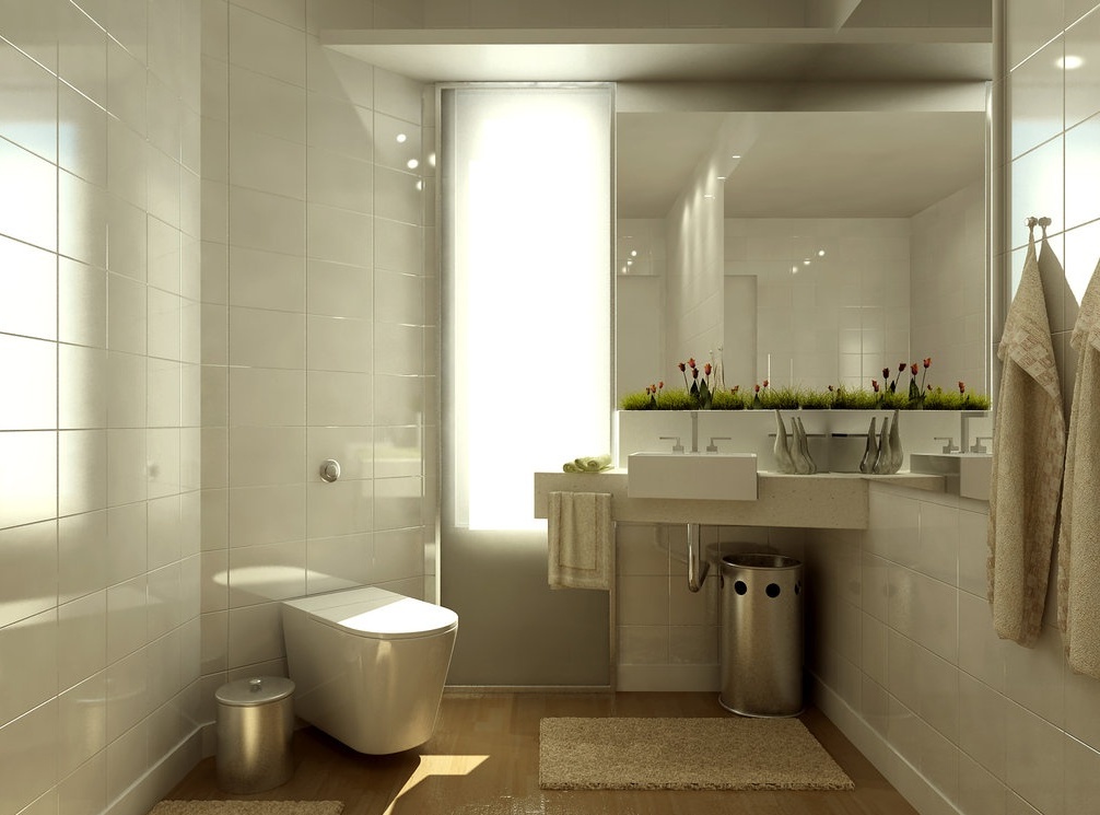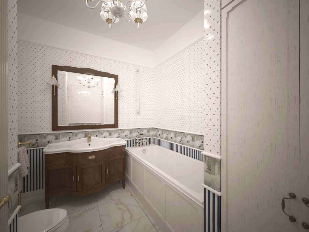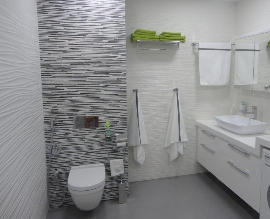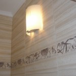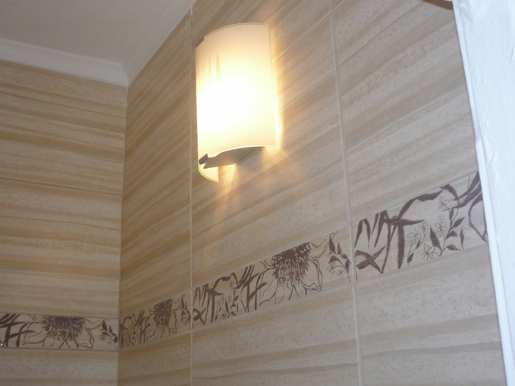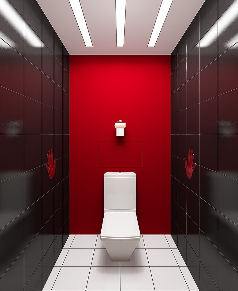 К примеру, если используется прямоугольная плитка, ее длинная сторона должна быть вдоль короткой стены санузла. Благодаря такому приему – расширится узкое помещение. Но если в такой обстановке высокий потолок, стоит оформить бордюр из плит, ориентировочно на пополам (пол-потолок). Причем, нижняя часть ярче (темнее).
