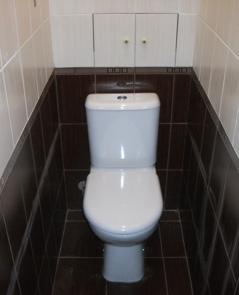 Но вот если Вы оформляете дизайн маленького туалета, то пластиковые панели использовать не желательно. А все потому, что при их монтаже обязательно делается обрешетка, которая «съест» некоторое пространство и так небольшого помещения.