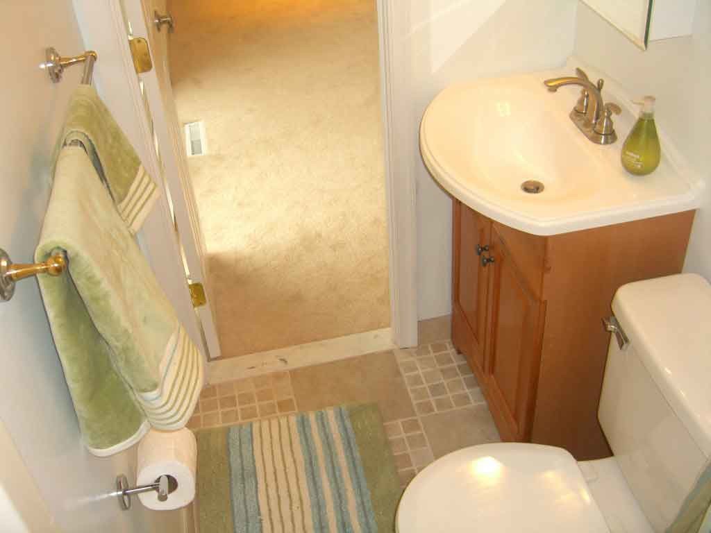 Для отделочных работ такого небольшого помещения используйте керамическую, гранитную или мраморную плитку. Благодаря огромному разнообразию этих материалов, помещение можно гораздо увеличить визуально.