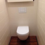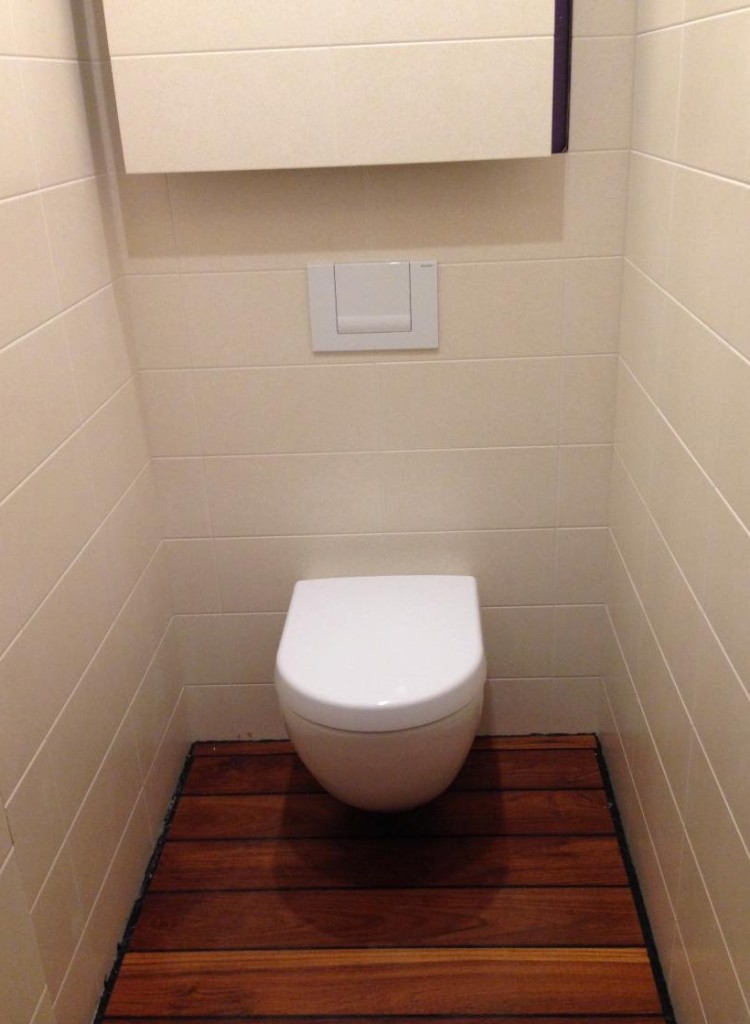 Главное – это с максимальной пользой использовать небольшое пространство. Лучше всего установить подвесной унитаз и встроить в стену сливной бачок. Такое расположение сэкономит немало пространства.