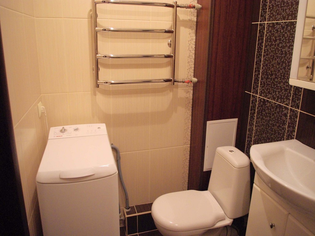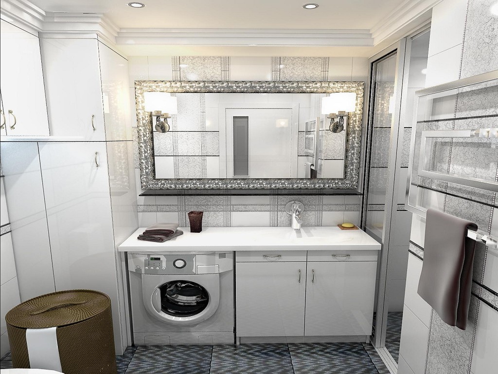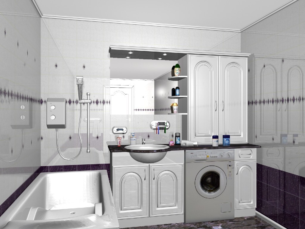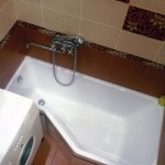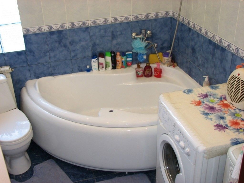 В первую очередь, в квартире-хрущевке необходимо устранить старую ванну. Лучше всего установить здесь углового типа, поскольку она в полной мере экономит пространство. И не стоит волноваться, что старая ванна чугунная и хорошо держит тепло. Современные ванны сделаны из очень качественного акрила и также очень хорошо сохраняют тепло. Благодаря освобождению пространства за счет установки угловой ванны, будет место, чтобы поставить стиральную машинку. Ведь в хрущевской кухне ее точно не вместить. Причем, совсем не обязательно прятать машинку внутрь встроенного шкафа. Ее можно поставить также и под умывальником.
