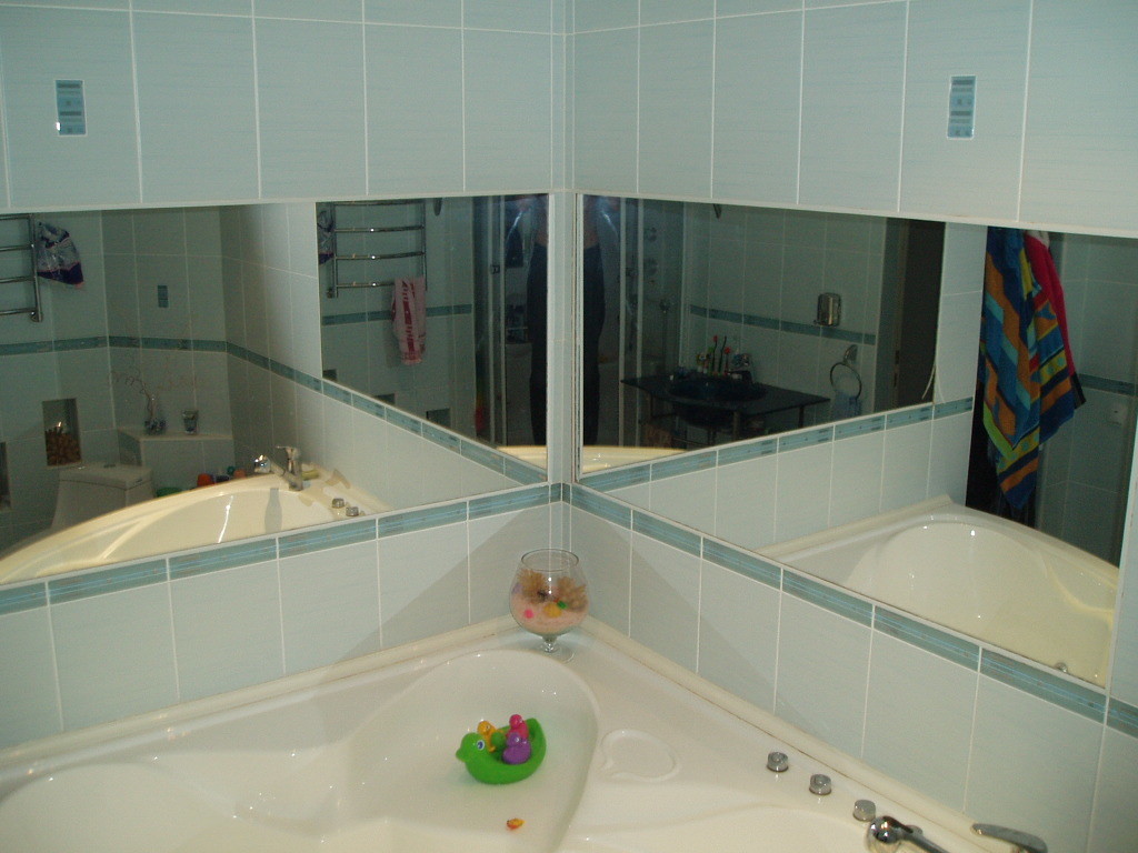 Отличной идеей интерьера ванной является зеркало, даже если очень большое. Но оно должно быть плоское и висеть на стене. Прекрасный вариант – если Вы сможете видеть себя в отражении в свой полный рост. Если вопрос поддержки чистоты Вас не страшит, то можно оформить и всю стену зеркальной.