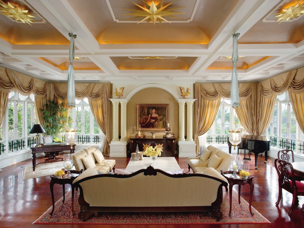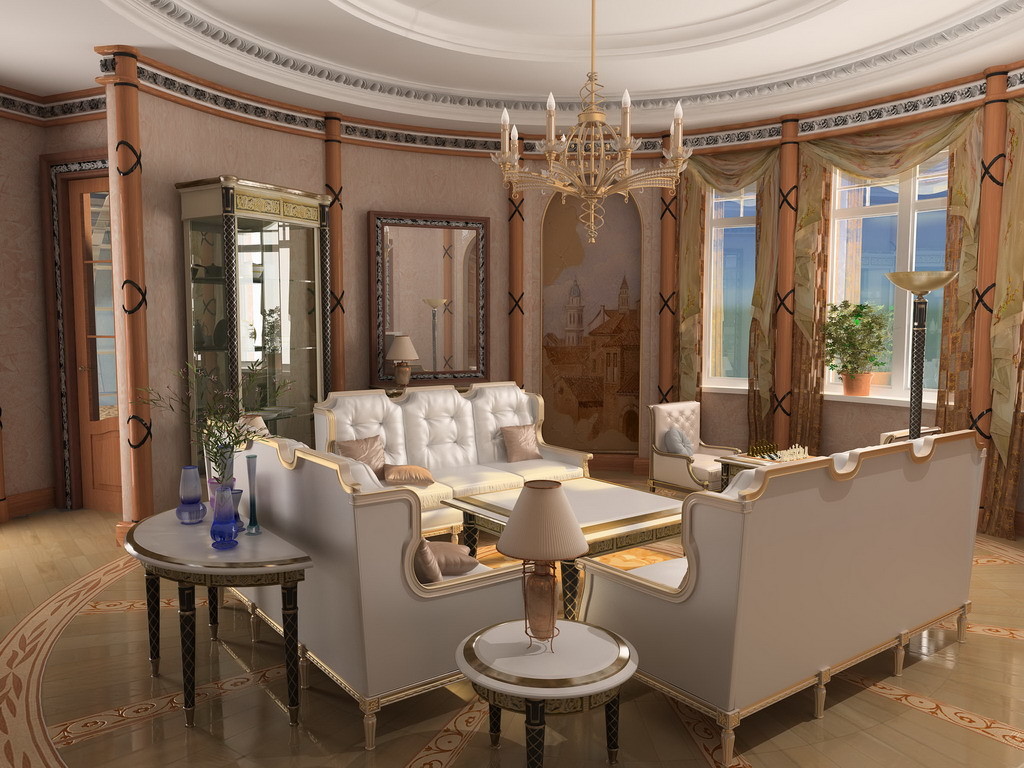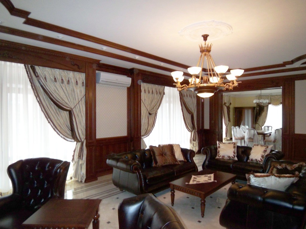 Классика – это вечно. Она была, есть и будет всегда в моде! Кроме того, классический интерьер говорит о том, что у хозяев достаточно изысканные вкусовые качества. Шторы представляют воздушную органзу, сочетаясь с тяжелыми непрозрачными тканями. Такой вариант является достаточно функциональным, поскольку органза позволяет лучам солнца «пробиваться» в гостиную, а непрозрачная ткань поможет «скрыться» от солнышка и чужих взглядов.