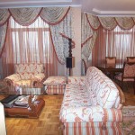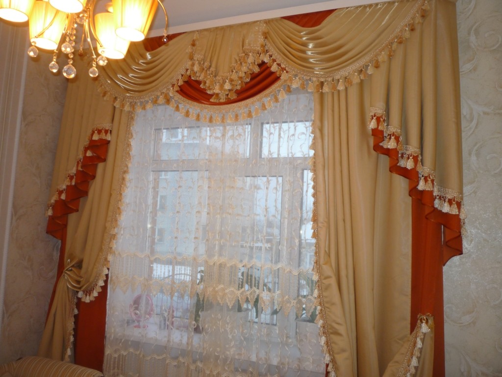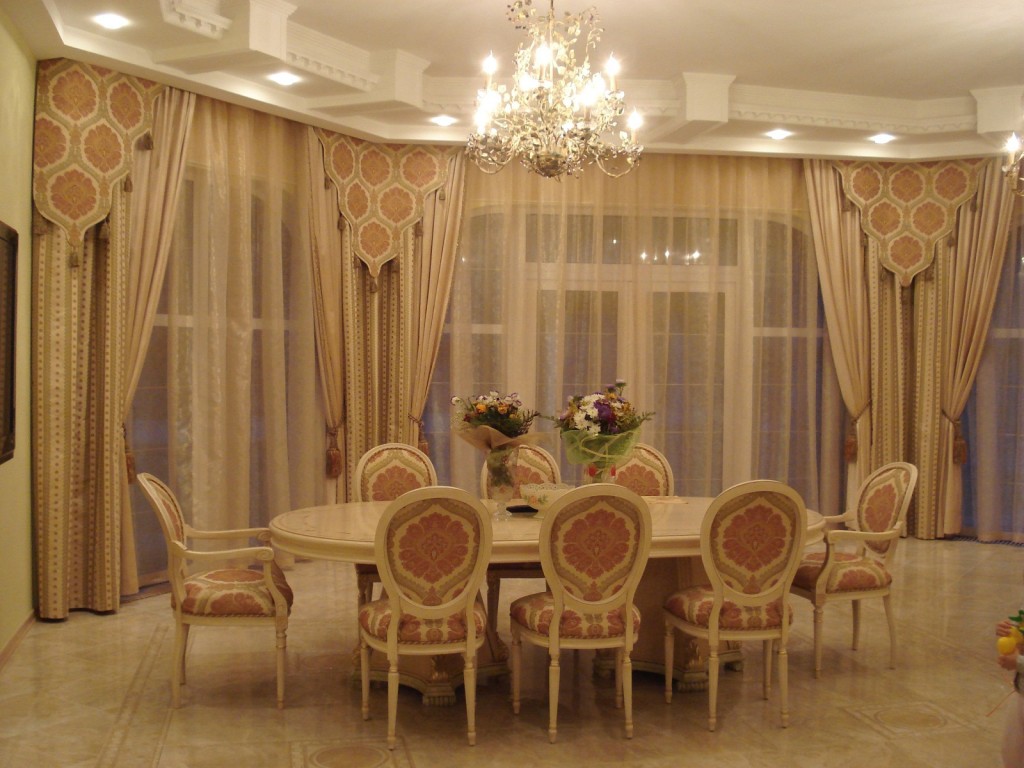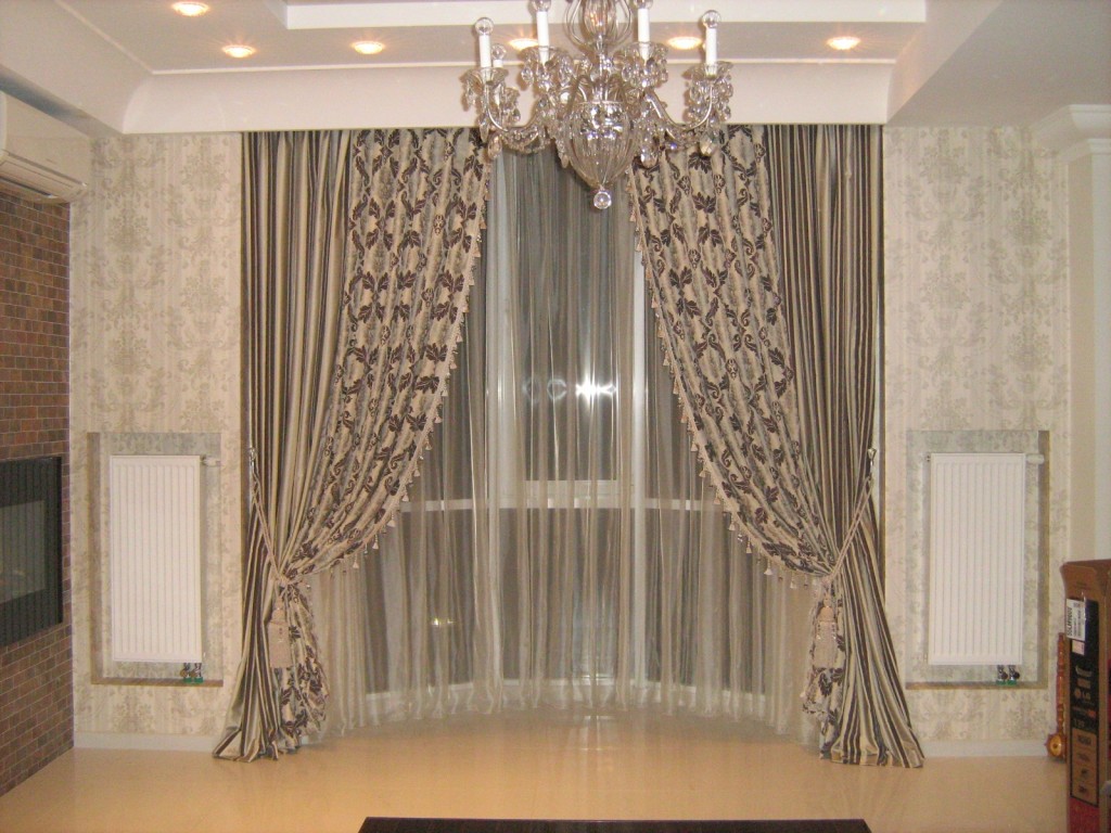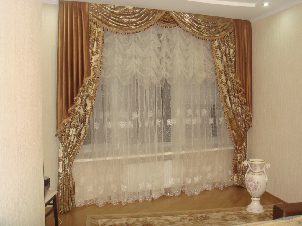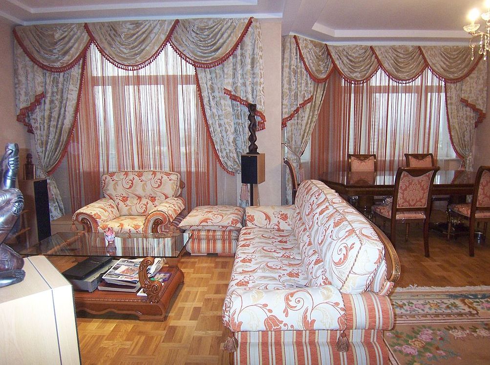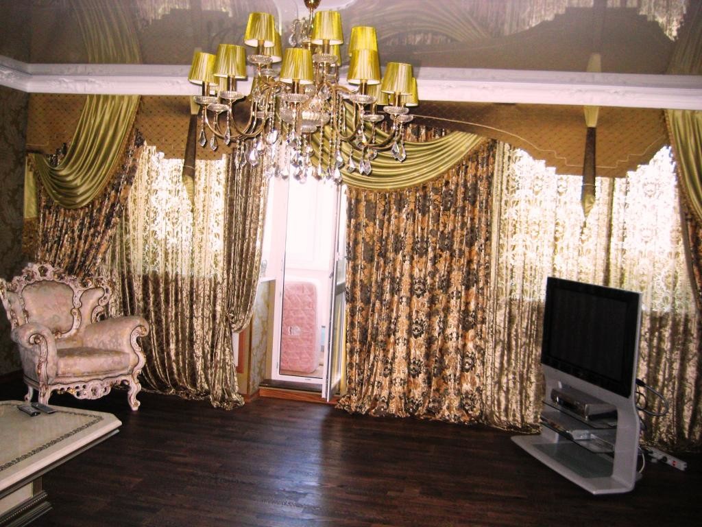 В классике допустимо изготовление штор совершенно из любых видом и типов тканей, с различной фактурой. Также могут использоваться тесьма, ламбрекены или шнуры. Основное, за чем нужно проследить, чтобы не было нарушено цветовое оформление штор и интерьера. Ведь именно в классике – шторы для гостиной являются главным акцентом!