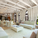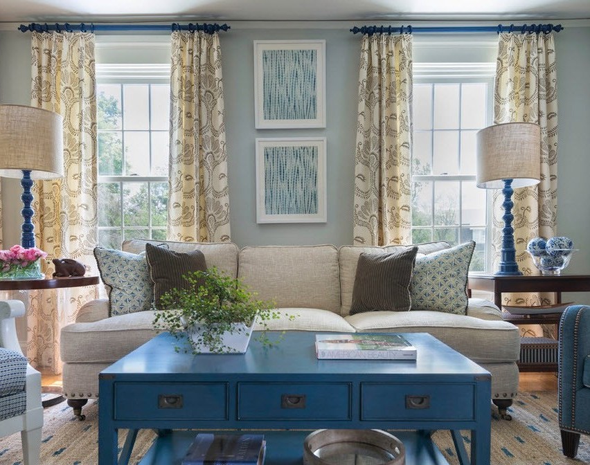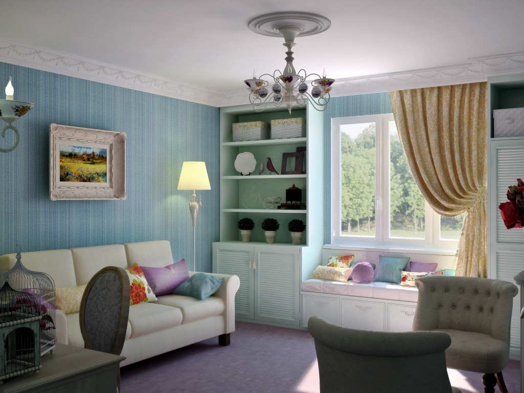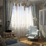 Здесь отображается деревенщина, все очень просто и скромно. Используются исключительно натуральные материалы, в том числе и дерево для потолков и полов, а шторы здесь должны быть достаточно просты в покрое и закрывать все окно. Другими словами, если рассматривать классический прованс, в нем должны быть шторы от самого потолка и до самого пола. На них могут быть самые разнообразные рисунки: цветы или целые букеты, причем абсолютно различных размеров, клетка или полоска в красно или сине-белом окрасе. Из тканей используется вышитые ситец или лен, а также целые полотна, вышитые крючком! Цвета выбирайте не очень пестрые. Используйте светлые или сочные оттенки. Обязательно учитывайте тот факт, что должен быть синий цвет. И, подбирая в гостиную новинки штор, учитывайте, чтобы они лаконично вписывались и сочетались с дизайном всей комнаты.