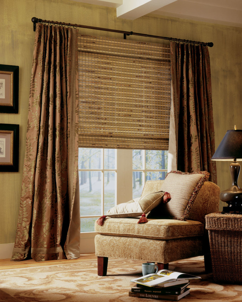 - Жалюзи. Они позволят идеально решить проблему, очень практичны, но с ними будет впечатление офисной, рабочей обстановки. И даже если их обыграть в цветовом решении, от них не будет того уюта, который мог бы быть.