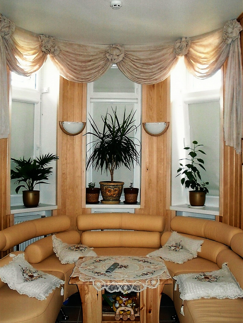 Так называют декорации, находящиеся перед шторами и, выполняющие «скрывание» карниза. Также ламбрекены очень прекрасно выполняют функцию зрительного увеличения высоты комнаты, а также пропорции самих окон. Они могут быть как мягкими (их пришивают к шторам, используют в классике), так и жесткими (крепится к стене прямо над карнизом).