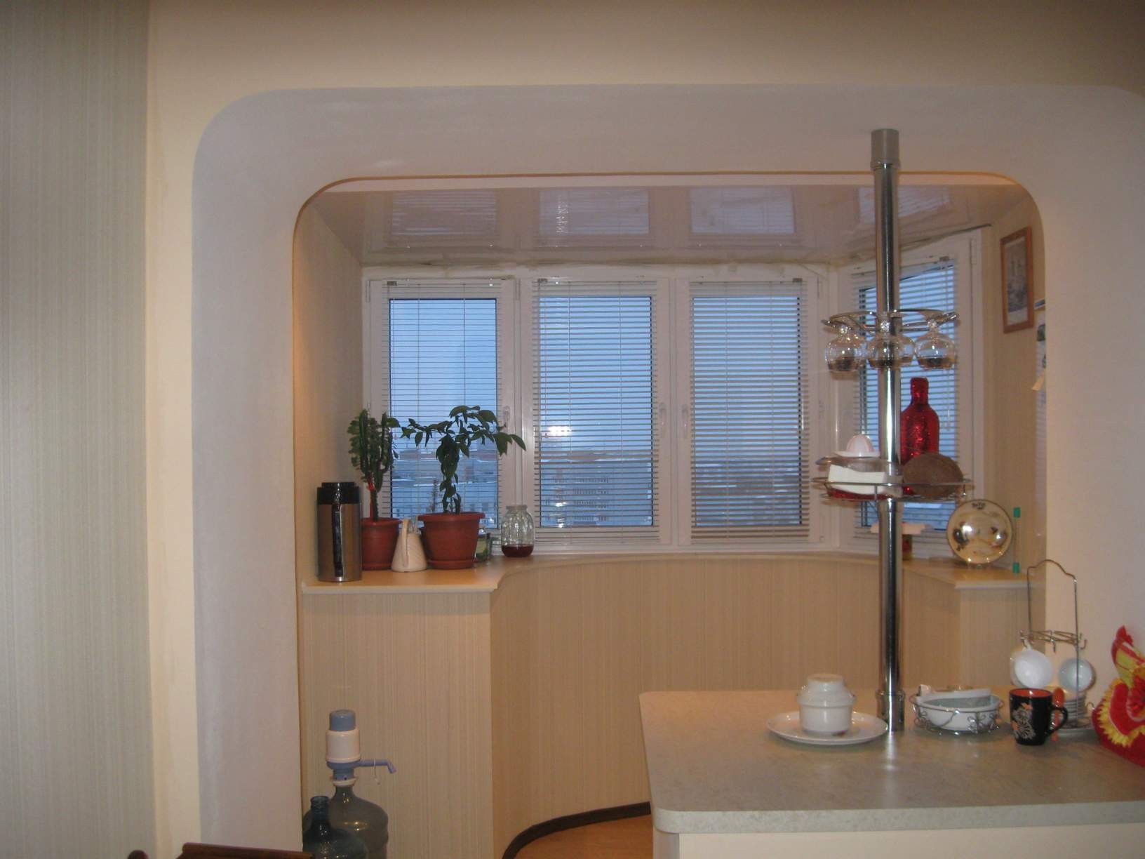 Стоит учесть и тот факт, что состыковка кухни и балкона не всегда гладкая и идеальная. Могут быть различные выступы, которые можно скрыть при помощи декоративных элементов при обустройстве дизайна интерьера. Например, карниз, который будет выделяться, можно сделать барной стойкой или вовсе рабочим столиком.