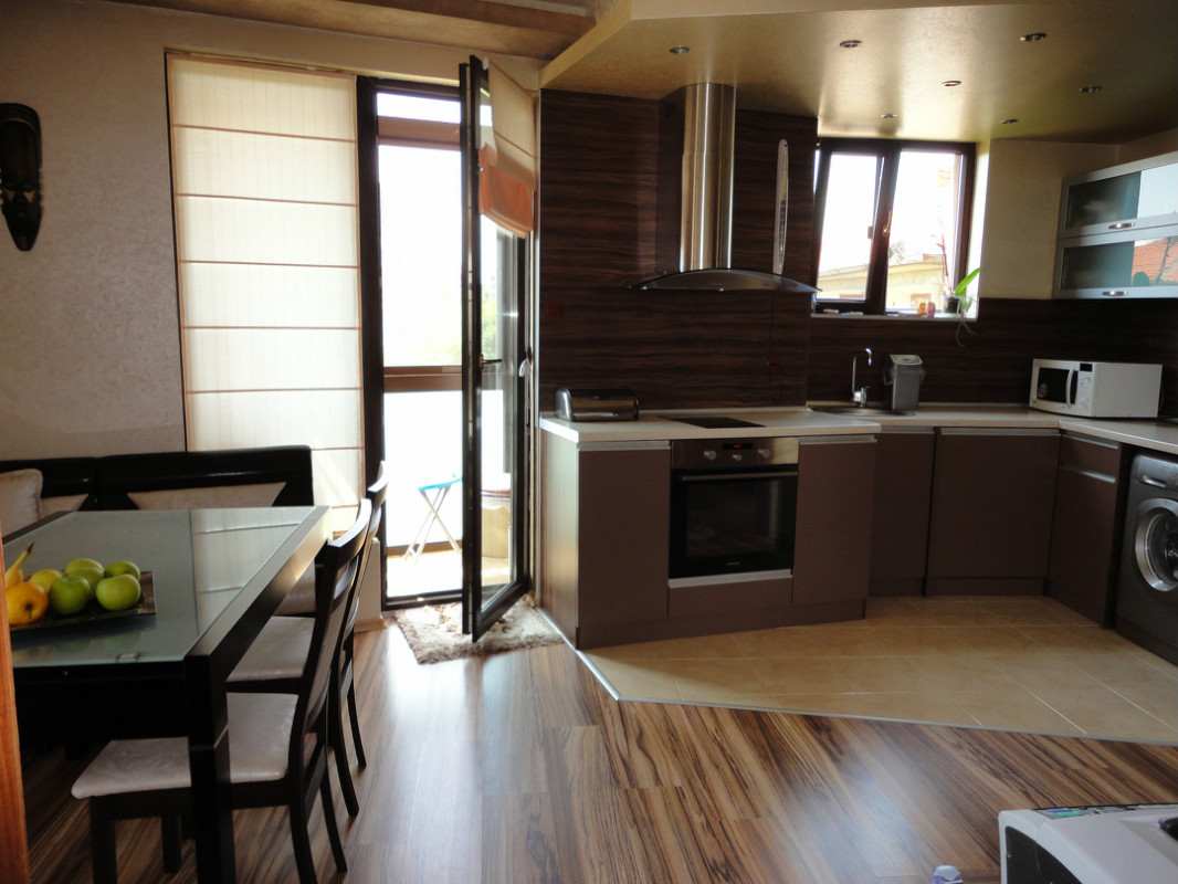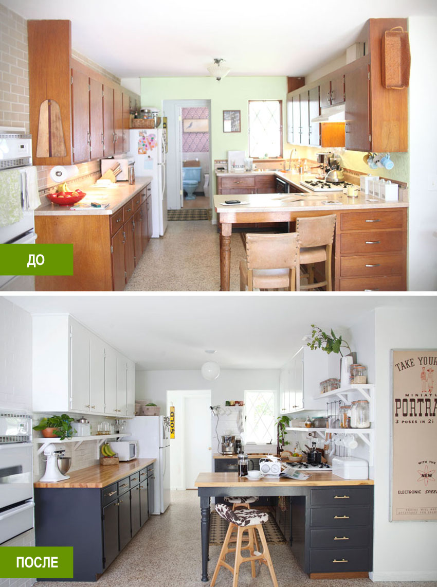 Оригинальным также будет решение обустройства окна и двери, вместо стены. В особенности, в том случае, если из Вашего окна открывается прекрасный вид! Таким образом, Вы сделаете кухню не только более просторной, но и светлой.
