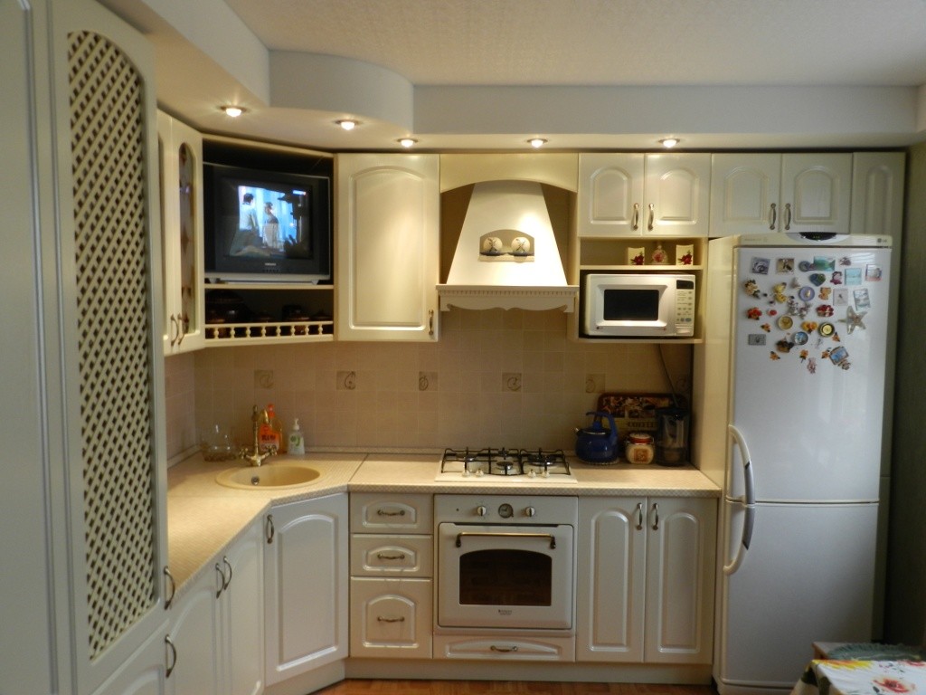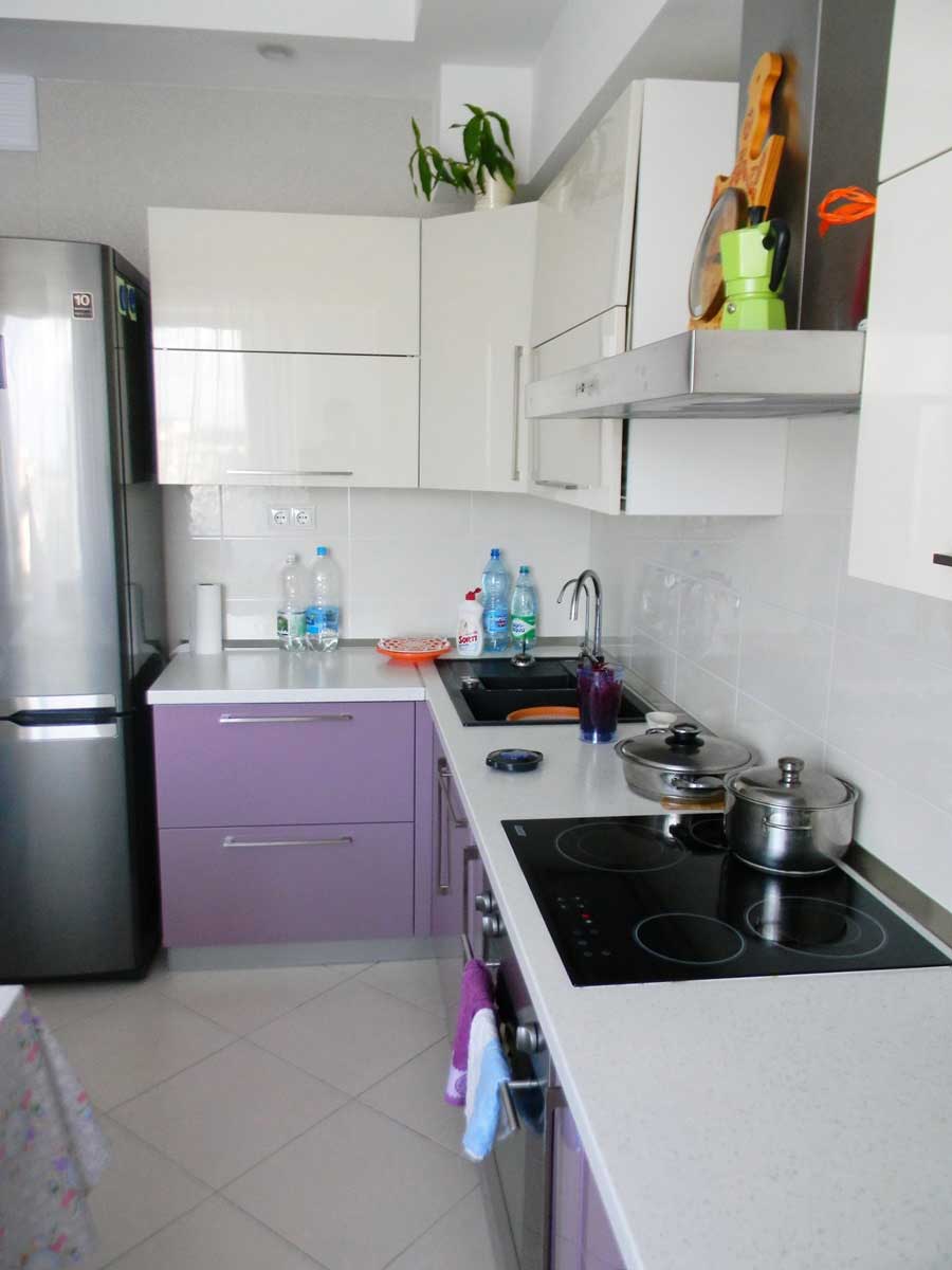 Формы стоит выбирать закругленные и плавные. Что касается цветов кухонных гарнитуров, то они, конечно же, могут быть совершенно любыми. Но, как всем известно, светлые цвета – самые подходящие для небольших помещений. Представьте только, как оригинально будет выглядеть белый кухонный гарнитур! Если Вы любитель чистоты и порядка, такой вариант однозначно Вам очень понравится. Кроме того, в маленькой кухне однозначно стоит выбирать модульные системы с выдвижными ящиками.