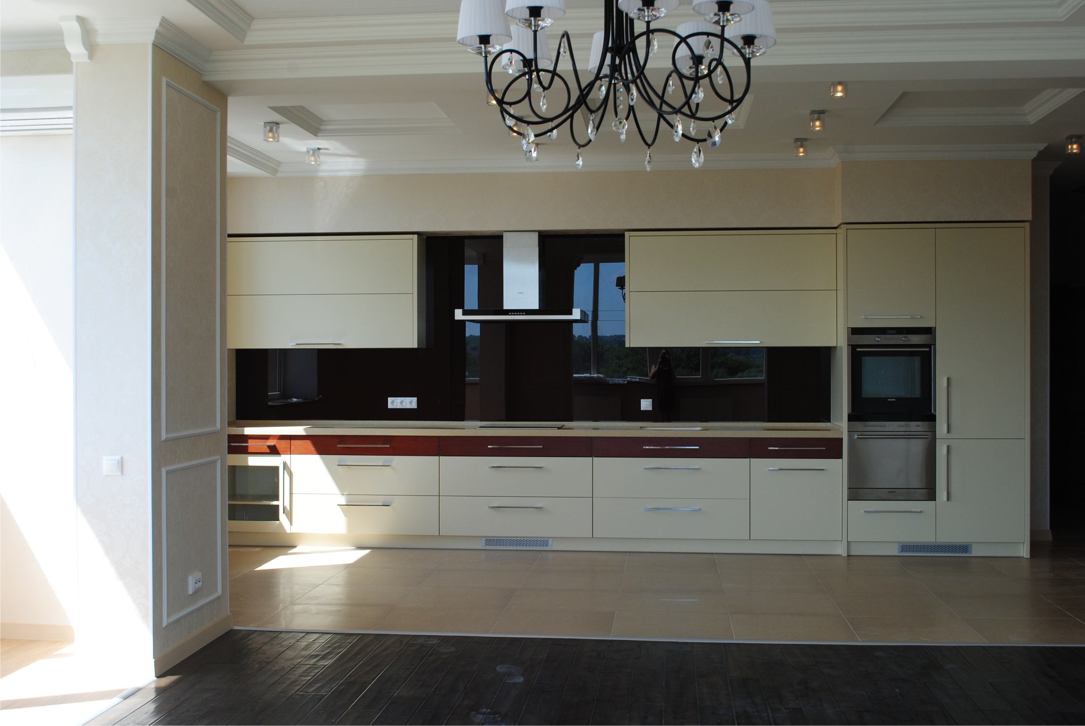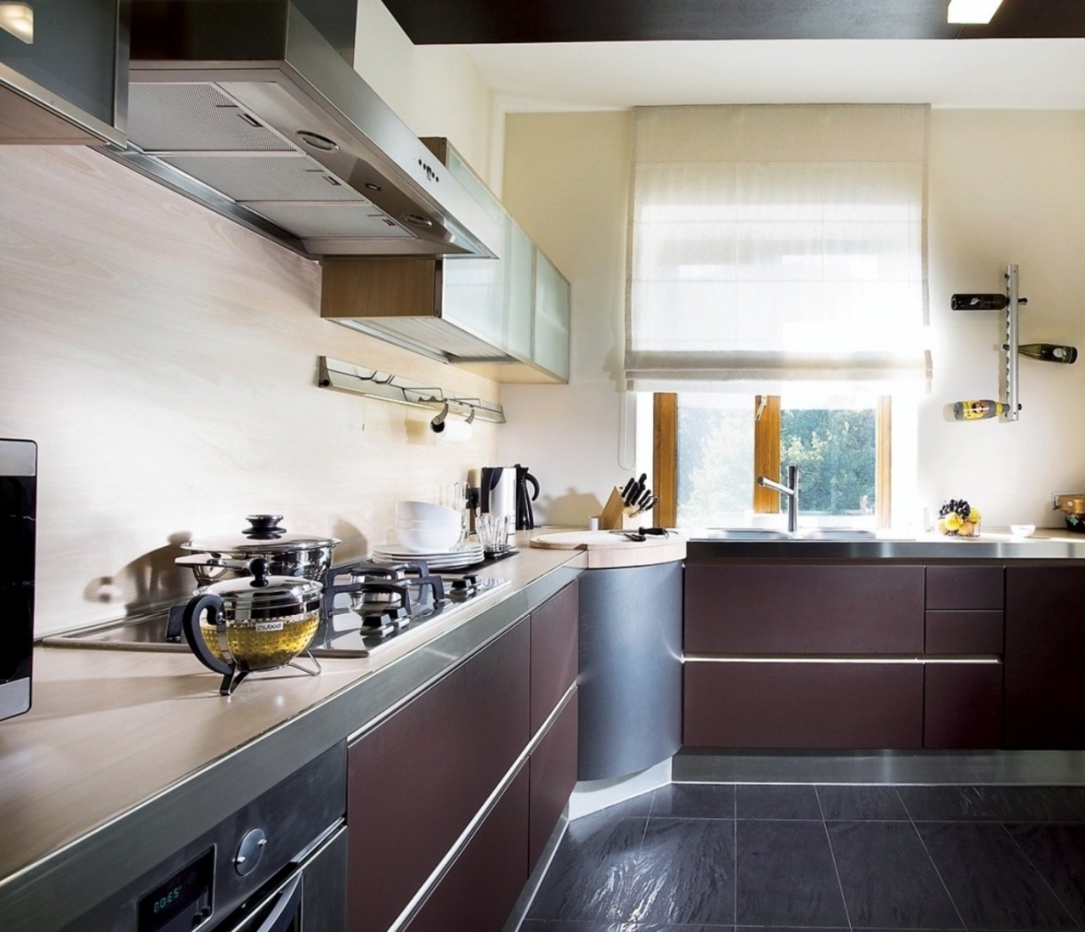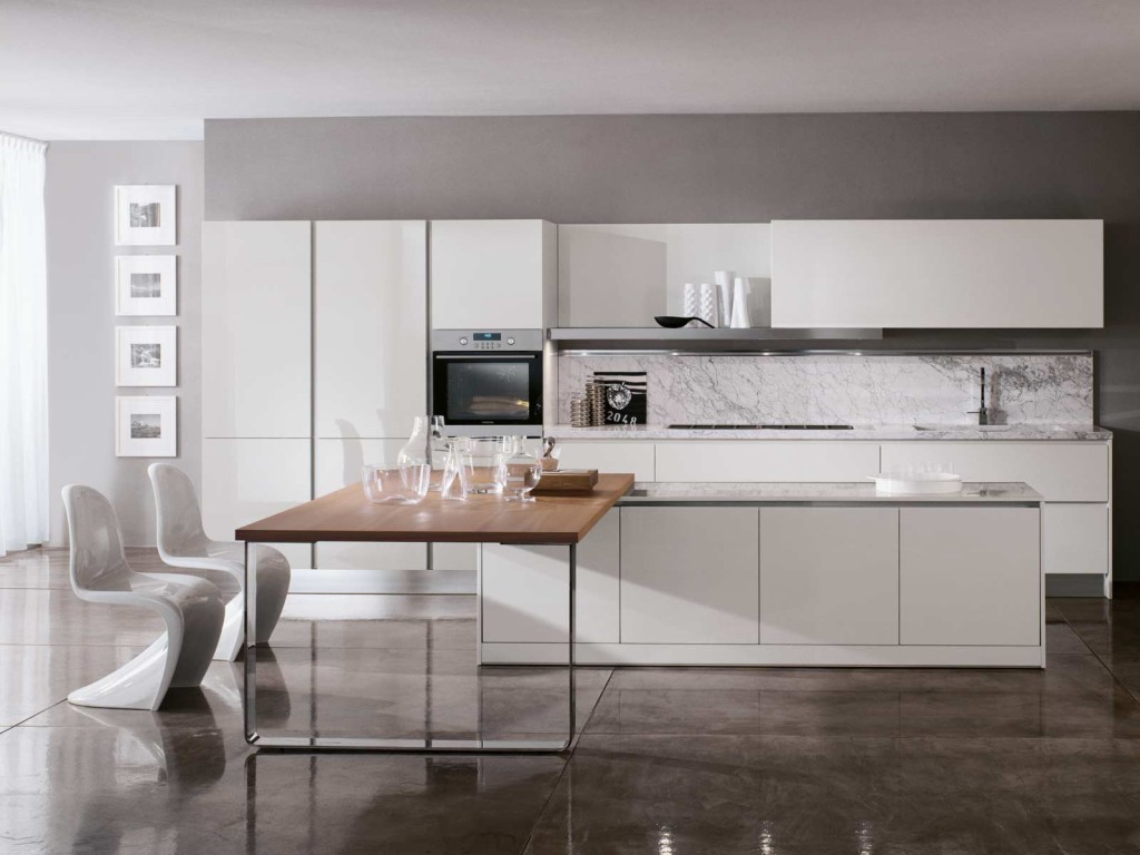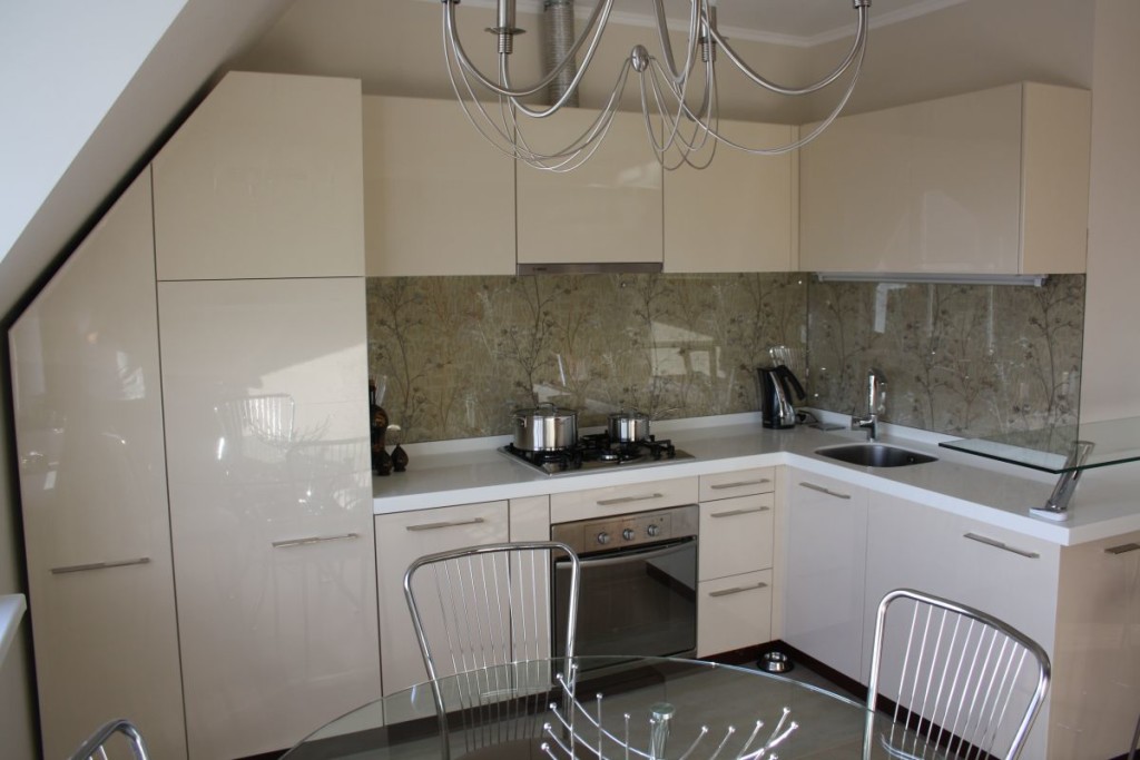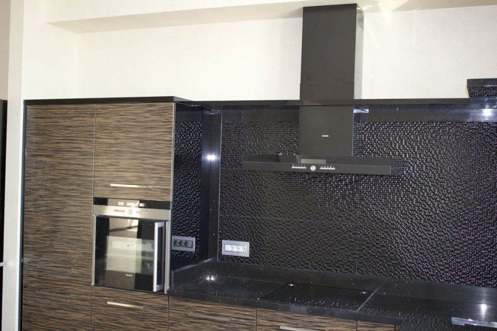 Меньше деталей – лучше Вам! В таком способе оформления техника должна быть «скрыта» под встроенным гарнитуром. Акцентировать и разнообразить интерьер можно при помощи оригинального фартука. Здесь возможно использование стеклянных материалов, а также металлических или деревянных (не декорированных).