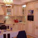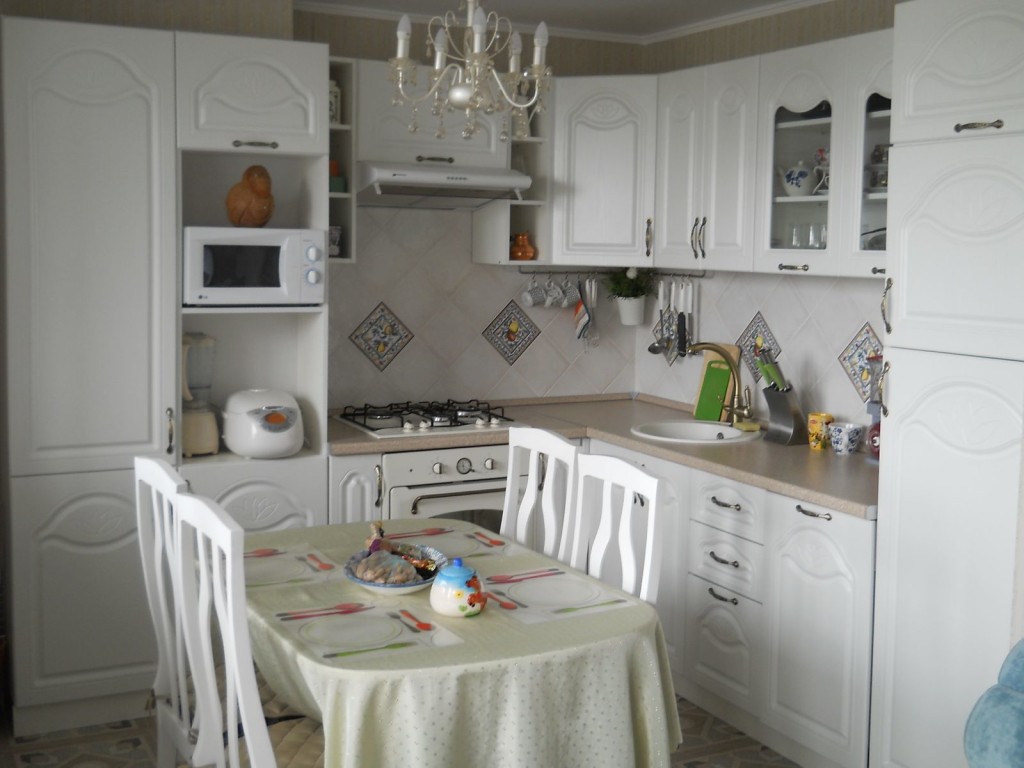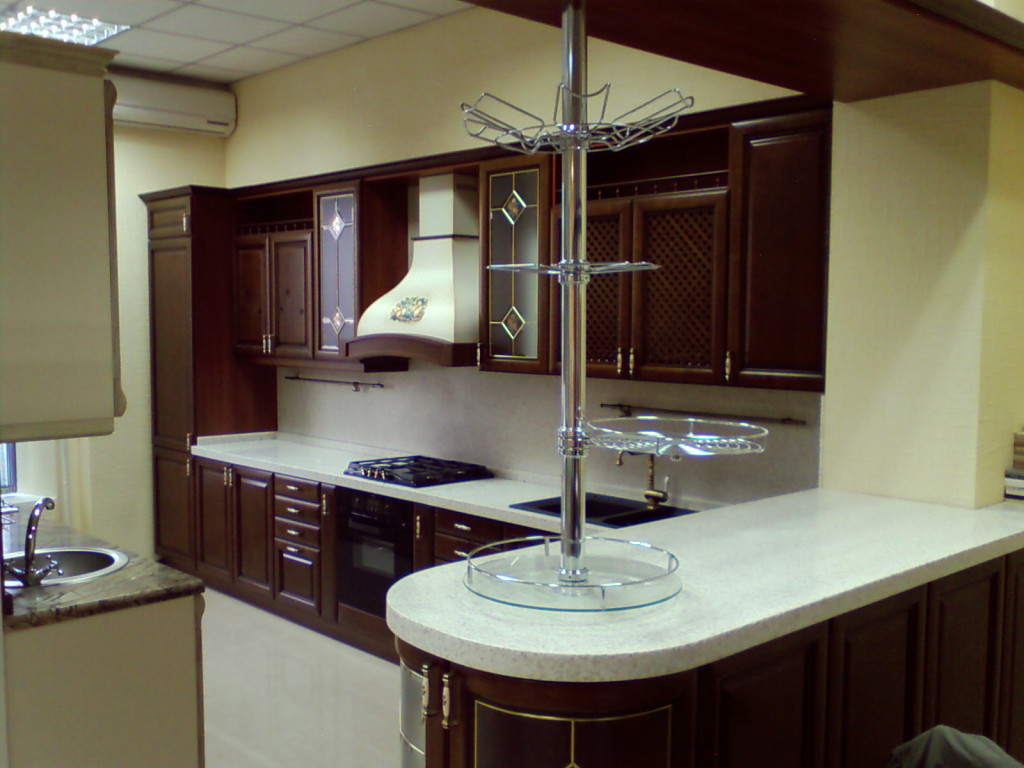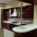 Если кухонное помещение широкое, угловой гарнитур можно заменить на П – образный. Правда, уголки и столы будут не совсем уместны, но зато такая кухня будет достаточно функциональной.