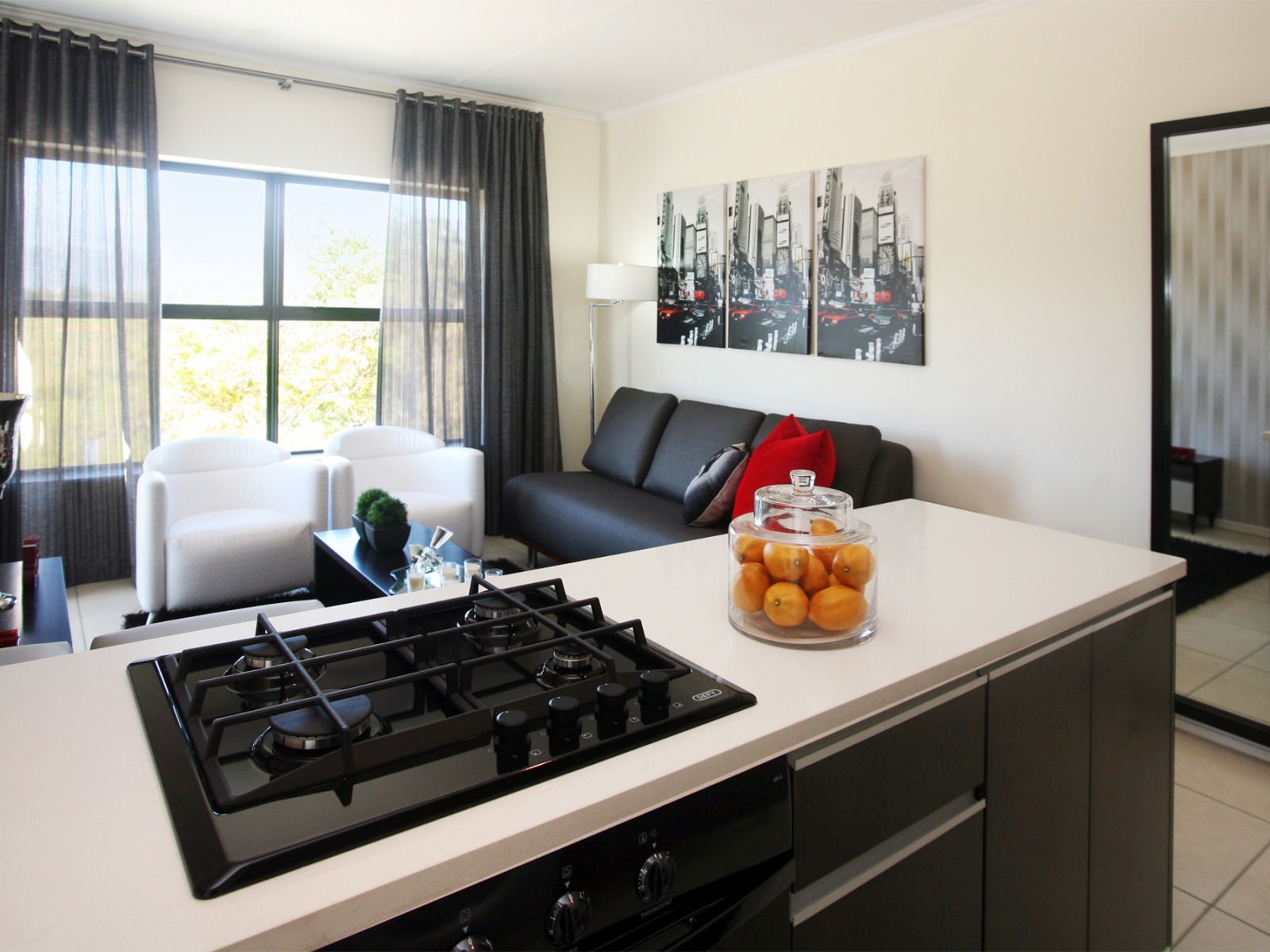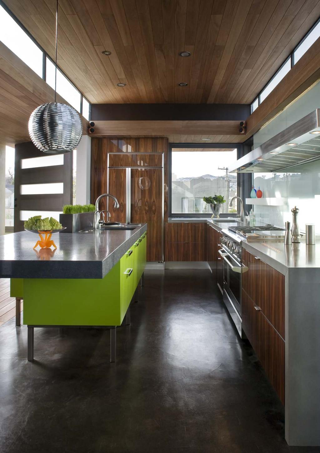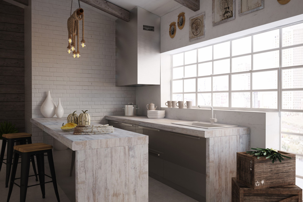 Здесь поставьте гарнитур угловым или островным способом, с выделенной трапезной зоной. Она будет отличным местом для посиделок с друзьями.