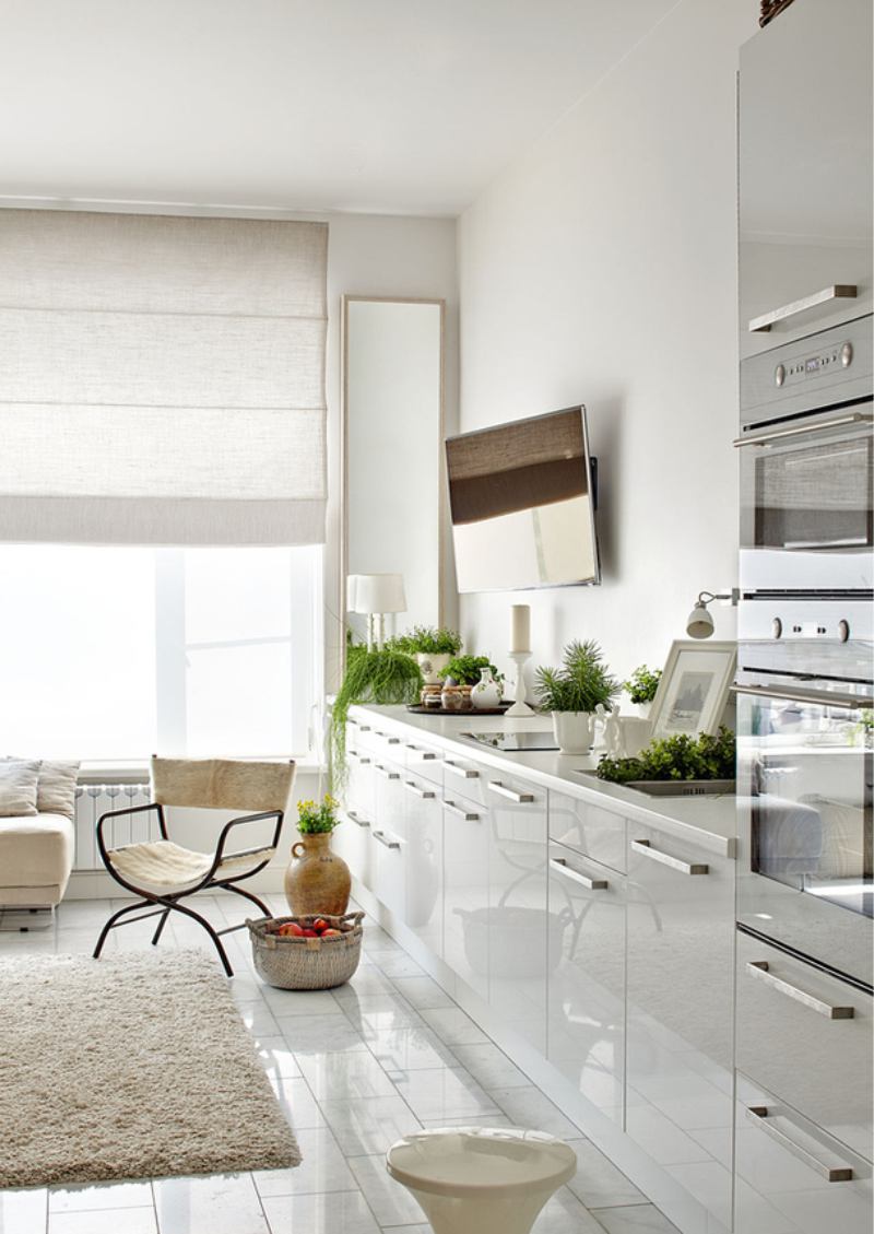 Чтобы не слишком перегружать визуально пространство, вместо верхних навесных шкафов можно сделать открытые полочки. Но все, что Вы будете на них хранить, должно быть всегда в идеальном порядке.