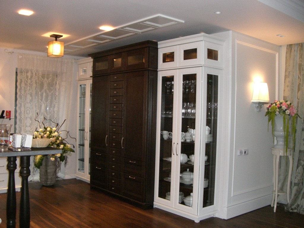 В качестве альтернативы тому, чтобы разделять кухонное помещение на «верх» и «низ», можно использовать так называемые шкафы – колонны, представляющие собой мебель, высотой пол — потолок. Хранить в них Вы сможете все что угодно: и посуду, и продукты. Но такой кухонный гарнитур для маленькой кухни не самый подходящий вариант. Скорее он подойдет для просторных помещений.