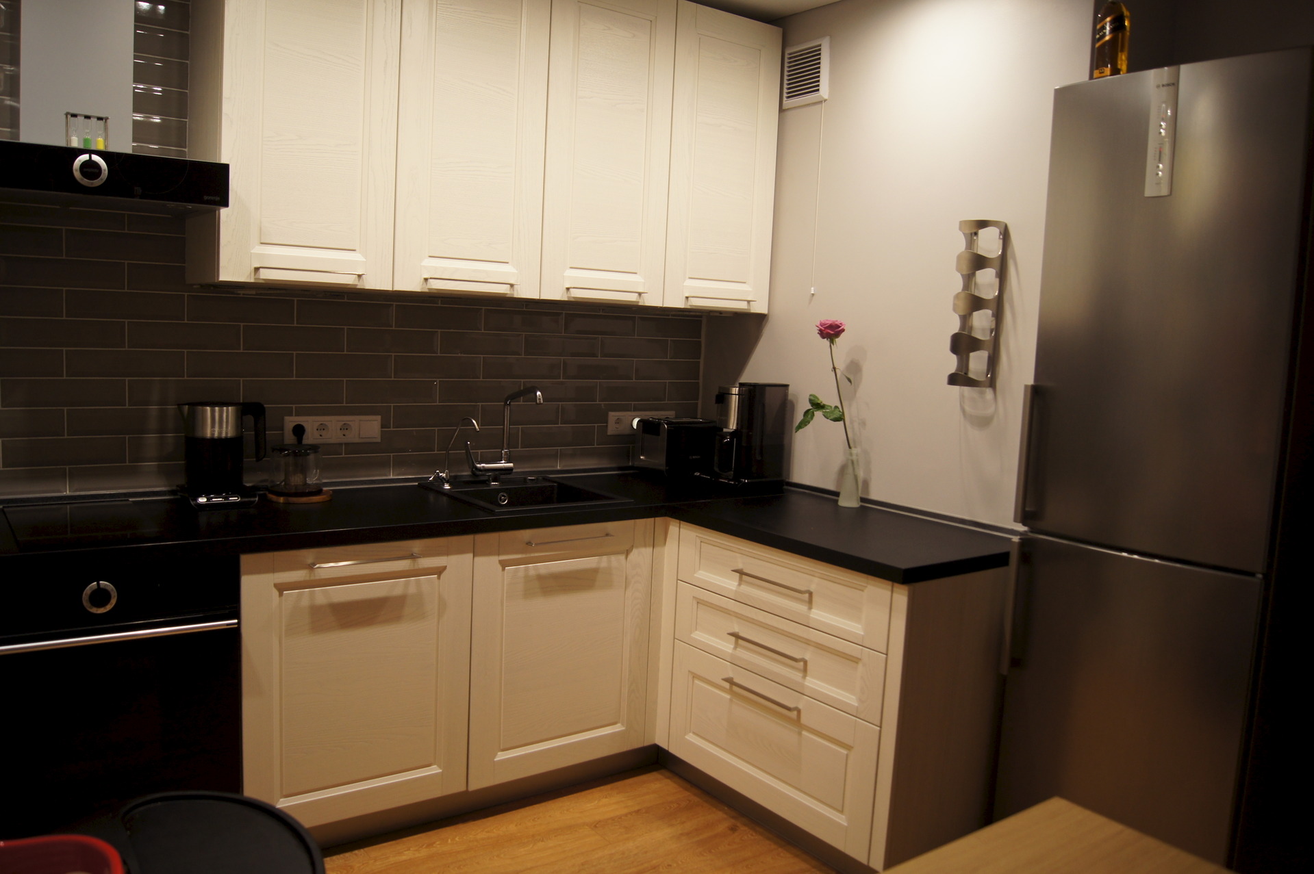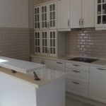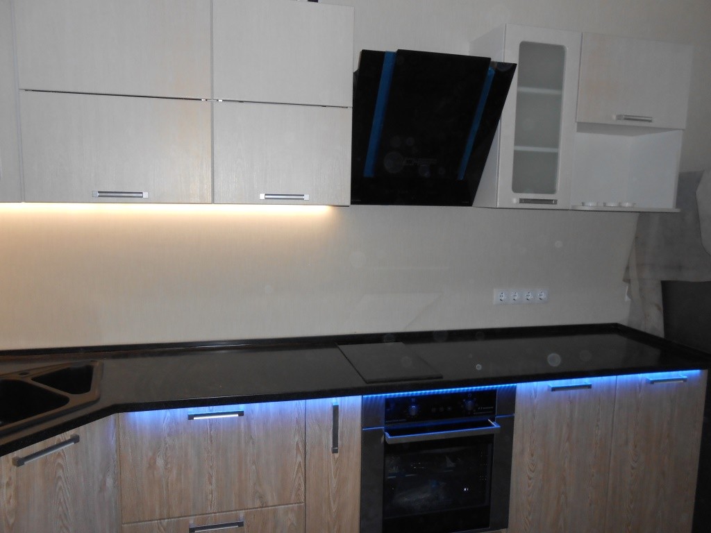 А чтобы в кухне не было видно стен, между модулями необходимо заранее сделать точные замеры. Поэтому очень важно знать точные размеры кухонного гарнитура. Если у Вас нет возможности заказать мебель по индивидуальным параметрам, присмотрите варианты модулей из разных производителей, в которых и шаговый размер также будет разниться.