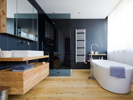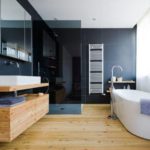 Как вариант напольного покрытия для помещения под ванну, можно использовать ламинат или плитку ПВХ. В данном случае, большую роль играет общее состояние комнаты. Просторное помещение, где напольное покрытие не подвергается постоянной влаге, позволяет использовать любой понравившийся материал. Можно скомбинировать пол из древесины и пол из камня в ванной. Все зависит от дизайна, желания внутреннего видения ванной.